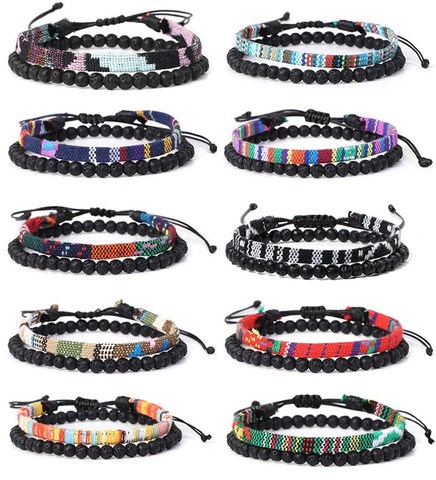 2Pcs a Set Gemstone Bead Stretch Surfer Beach Bracelet Bohemian Woven Bracelet for Couple 4MM Lava Stone Beads Bracelet